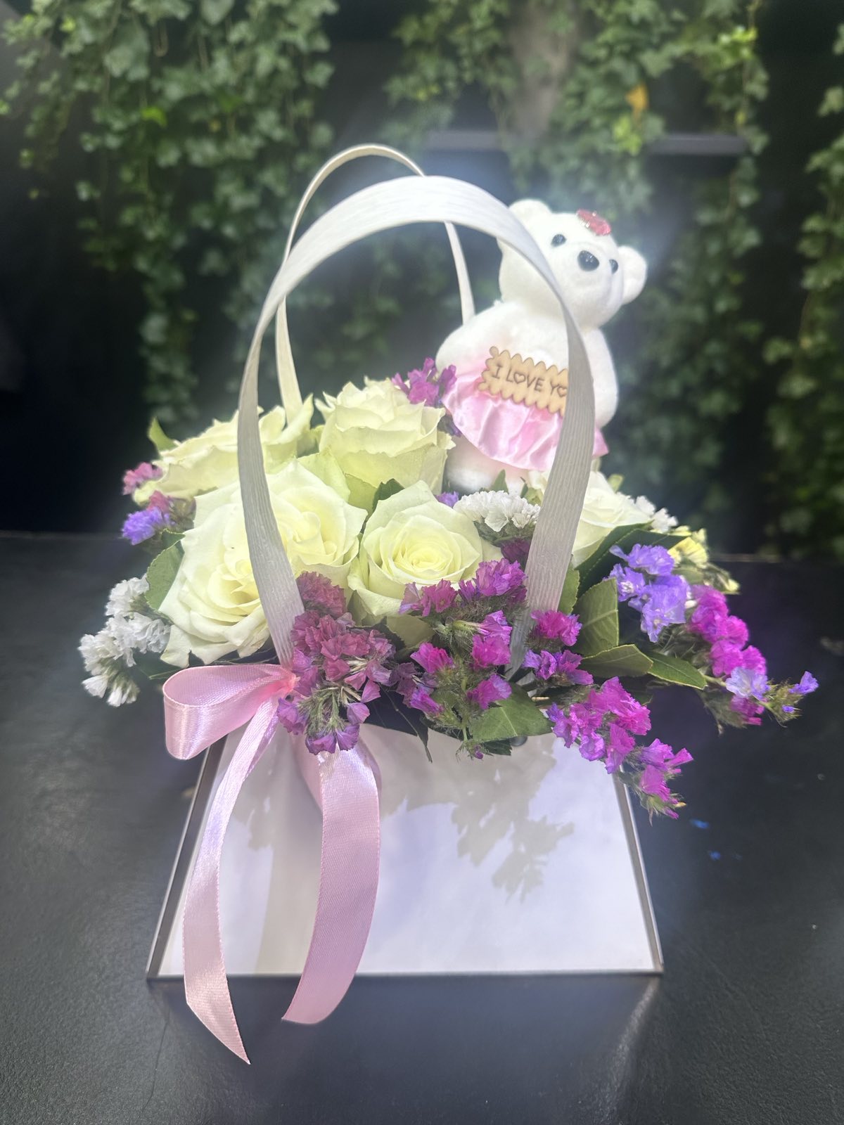 • Τσαντάκι με λουλούδια και λούτρινο αρκουδάκι ροζ
