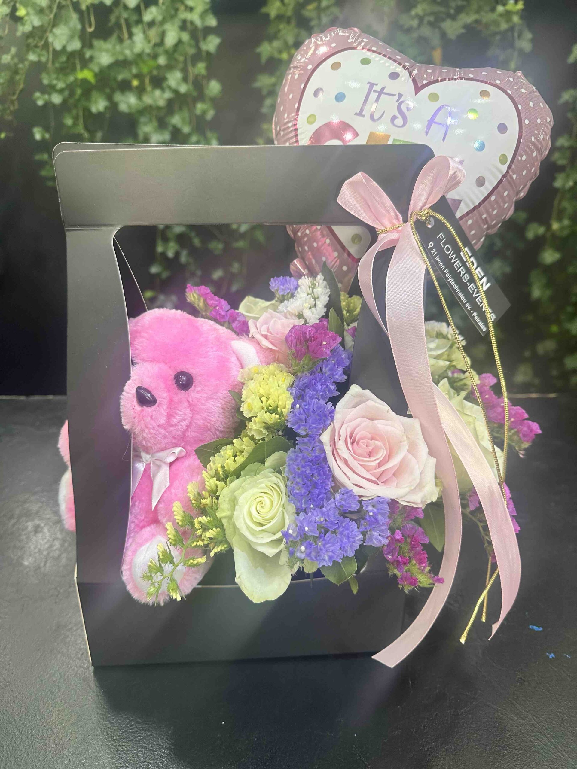 • Κουτί με τριαντάφυλλα Ροζ λούτρινο , ροζ μπαλόνι
